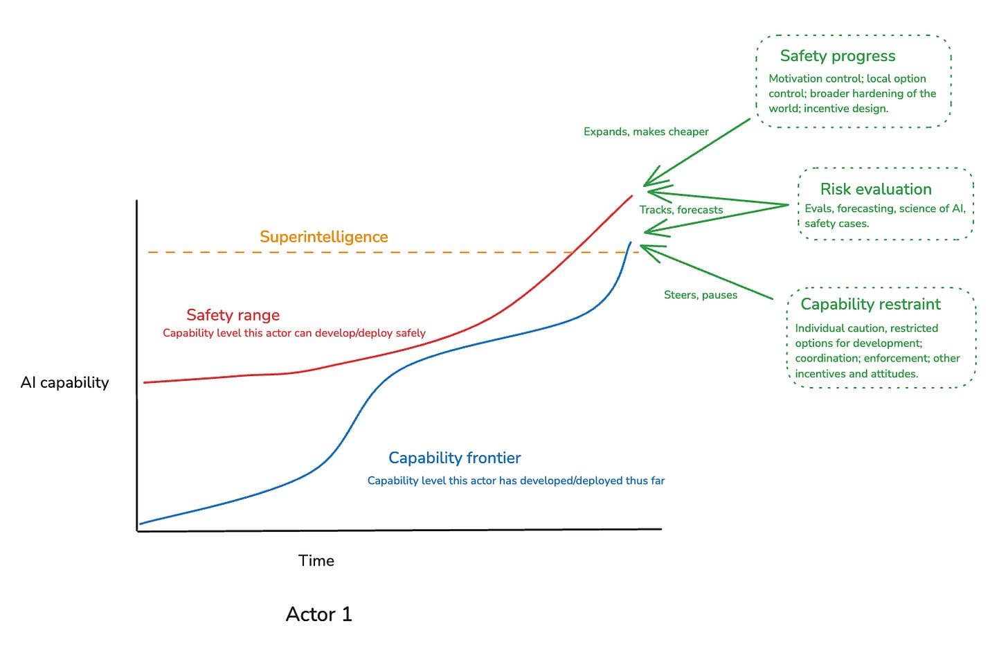 Of course, there’s also a variant here where Actor A actively slows down actor B, but then doesn’t engage in individual capability restraint themselves. But I’m here especially interested in actions motivated by the sorts of safety concerns that would also motivate individual capability restraint.
